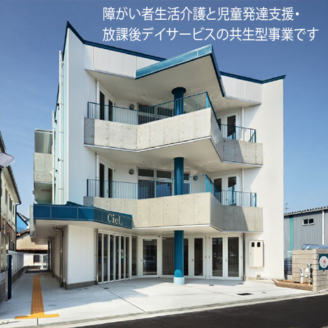 障がい者生活介護と児童発達支援・放課後デイサービスの共生型事業です。